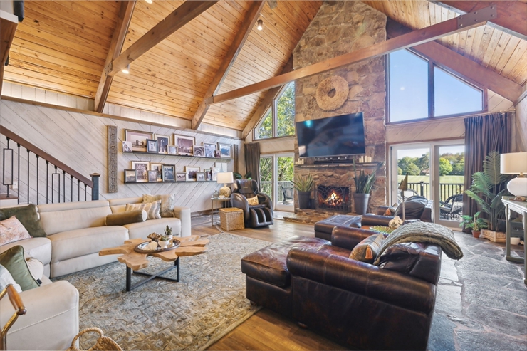 The entry flows directly into an open great room anchored by a 25-foot stone fireplace that stretches toward vaulted tongue-and-groove ceilings with exposed wood beams. Natural light streams through multiple windows and eleven sets of patio doors throughout the approximately 6,121-square-foot layout. The floors alternate between hardwood and slate, with tile in the bathrooms.